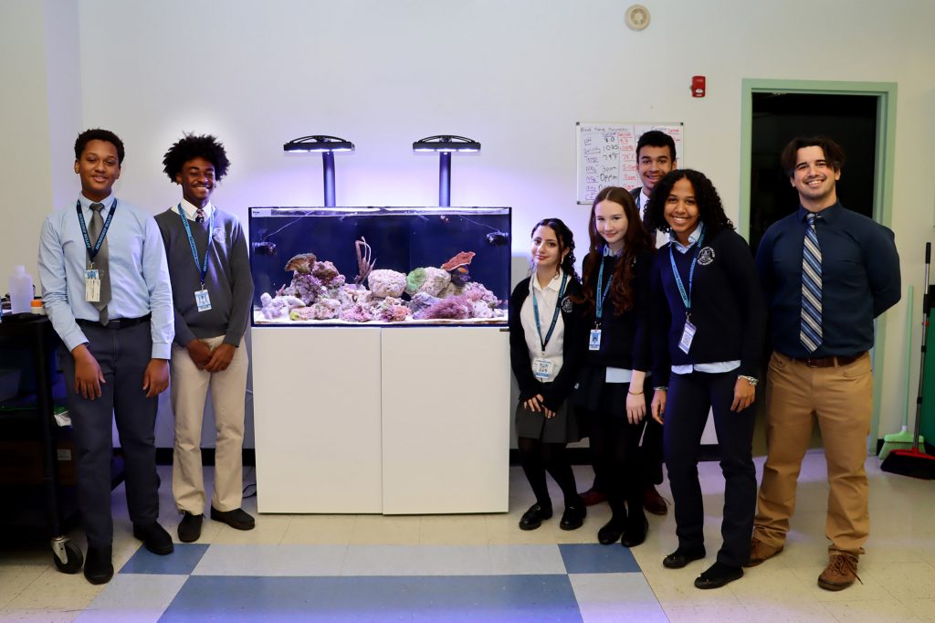 This school year, Molloy installed a saltwater aquarium in the Biology Lab, creating an exciting new hands-on learning opportunity for our students! Funded by donations from the 2024 Stanner-a-Thon, the aquarium began as an idea from biology teacher Mr. John Attard ’06. As a longtime saltwater aquarium owner, Mr. Attard saw the educational value of bringing a reef tank into the classroom, especially at a school that offers Biology, Marine Biology, and a thriving Biology Club.