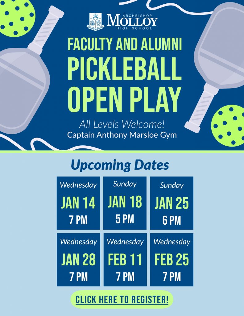 Please join us for upcoming Pickleball Open Play, hosted here at Molloy! Enjoy a great workout, meet other members of our community, or learn the game from scratch! All skill levels are welcome. This series of events is free and open to all adult players in our community (alumni, faculty, family, friends). See/click the flyer below for details and to register.
