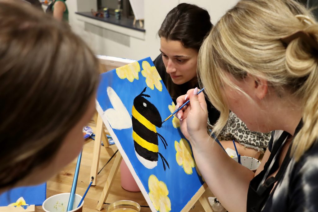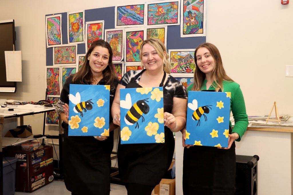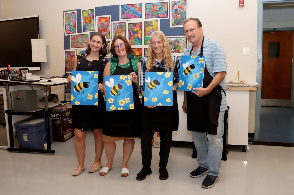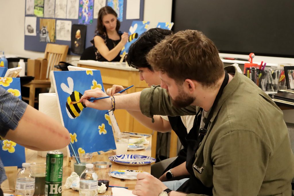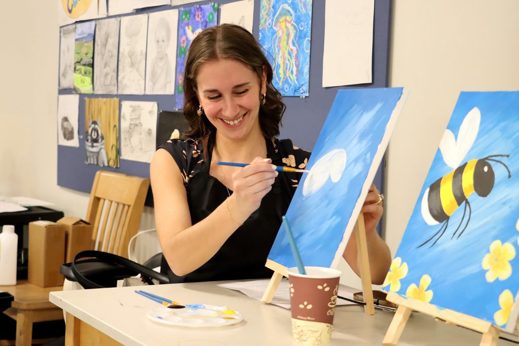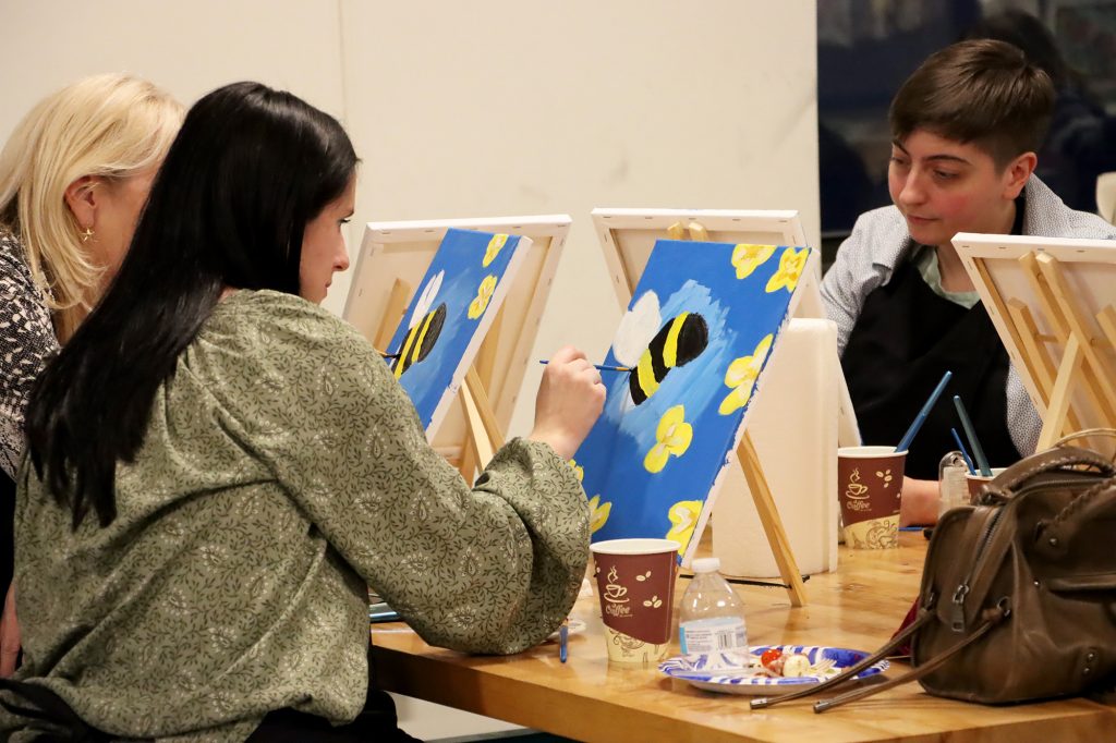 On Thursday, April 16th, alumni and friends gathered in Molloy’s recently renovated Art Studio for a special evening of Paint & Sip! Throughout the event, Molloy’s Communications Coordinator Ms. Maria Calakos ’13 (pictured top right) guided participants step-by-step in creating their own unique bee and flower paintings. The theme was chosen to mark the arrival of spring and to celebrate the beehive that is Molloy! As they painted alongside friends and fellow alums, guests enjoyed a variety of small bites and beverages. This event was a fun way for our community to connect, and one that we hope to grow in the future! Special thanks to Alumni Development Officer Ms. Sarah Quispe ’19 and Ms. Calakos for organizing and leading this wonderful evening.