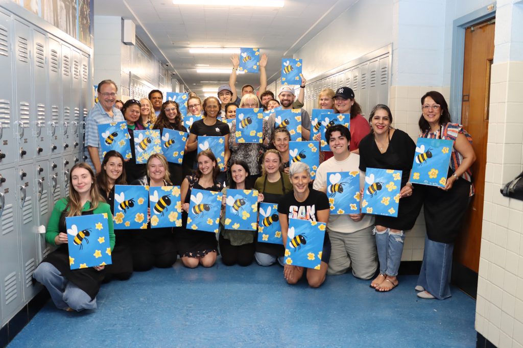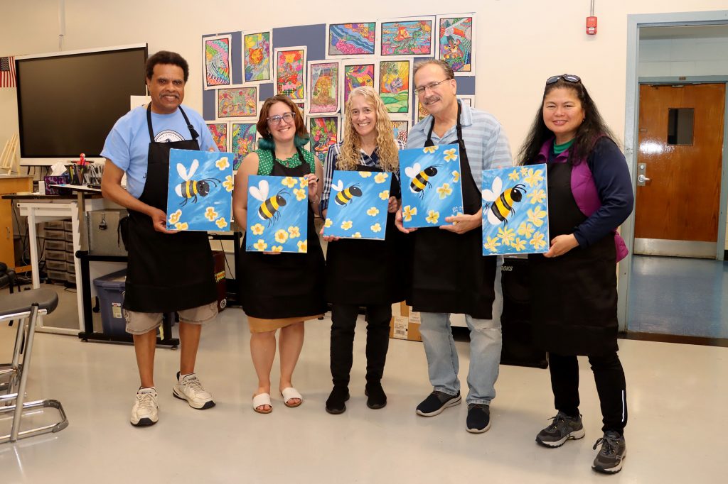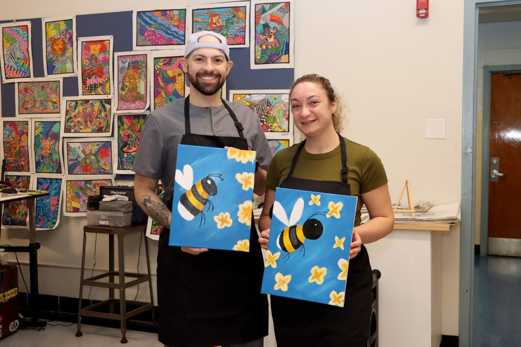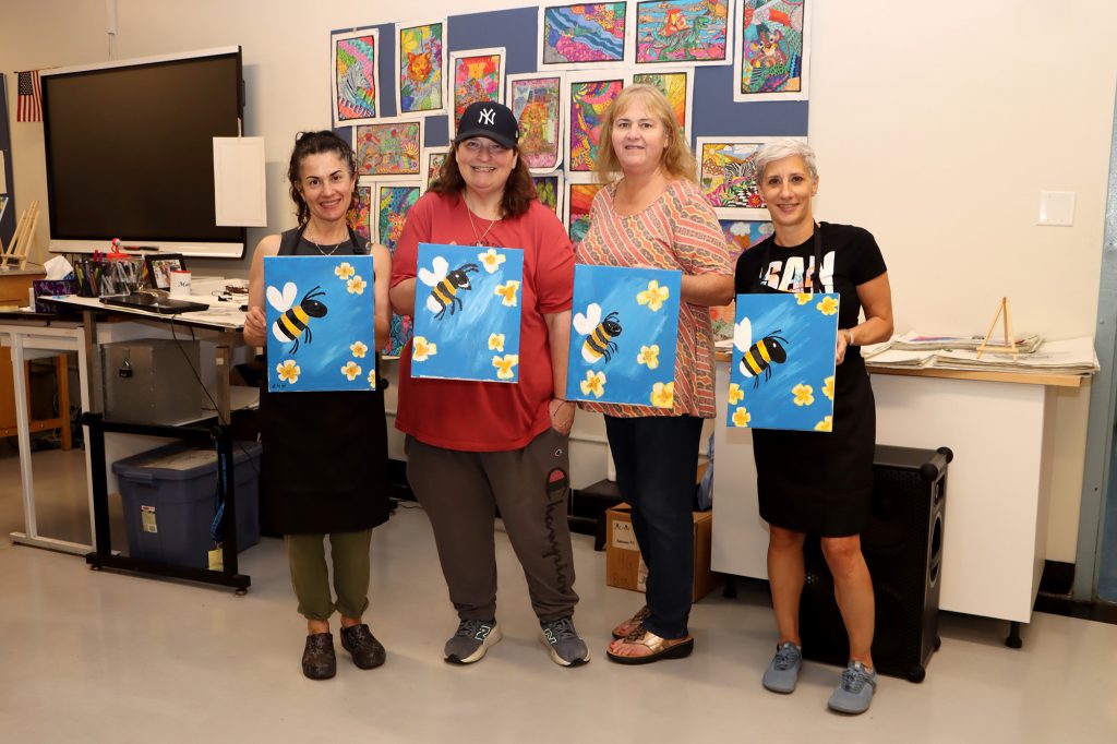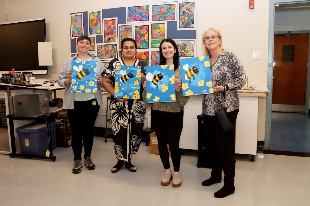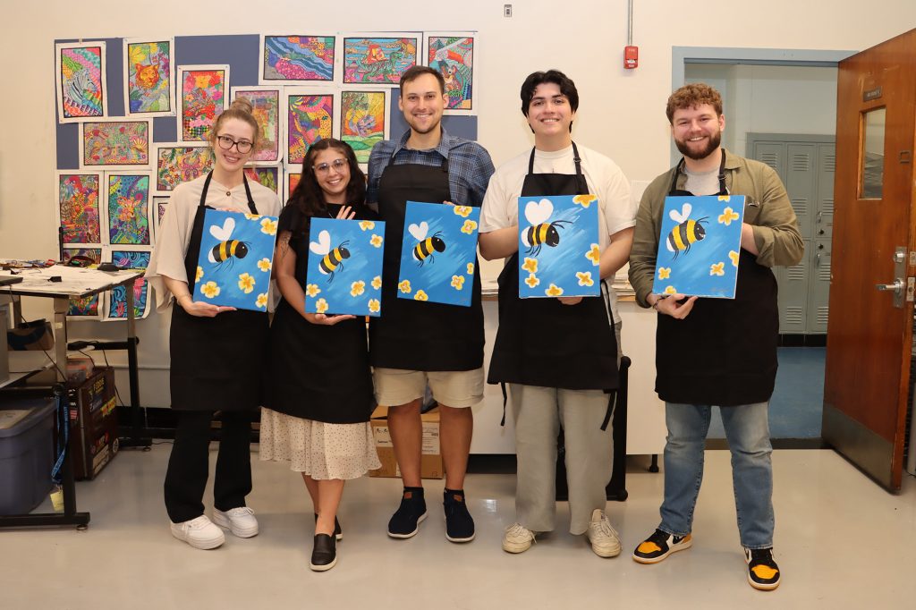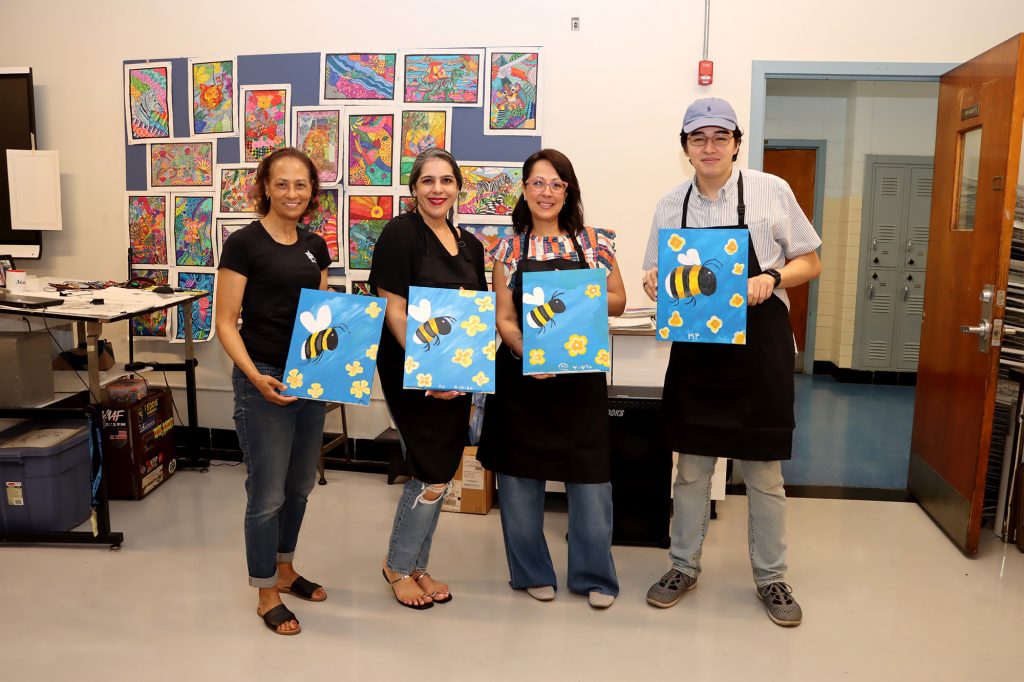 On Thursday, April 16th, alumni and friends gathered in Molloy’s recently renovated Art Studio for a special evening of Paint & Sip! Throughout the event, Molloy’s Communications Coordinator Ms. Maria Calakos ’13 (pictured top right) guided participants step-by-step in creating their own unique bee and flower paintings. The theme was chosen to mark the arrival of spring and to celebrate the beehive that is Molloy! As they painted alongside friends and fellow alums, guests enjoyed a variety of small bites and beverages. This event was a fun way for our community to connect, and one that we hope to grow in the future! Special thanks to Alumni Development Officer Ms. Sarah Quispe ’19 and Ms. Calakos for organizing and leading this wonderful evening.