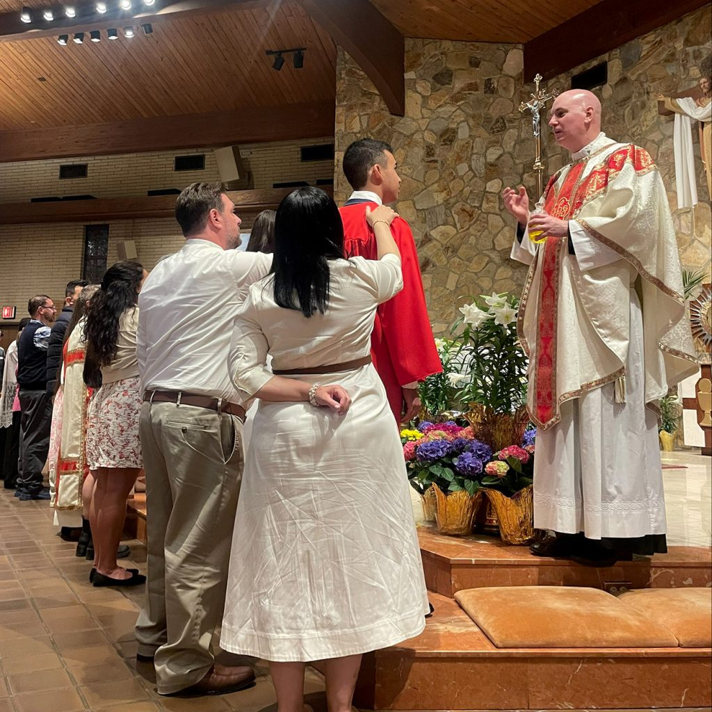 During this year’s Easter Vigil Mass at Our Lady of Hope RC Church, six students from Molloy received their Sacraments of Initiation from pastor Fr. Peter Purpura ’99. Deacon John Kramer, a religion teacher and track coach at Molloy, was a sponsor to one of the students, while Fr. Nick Colalella, Molloy’s Chaplain, sponsored another student.