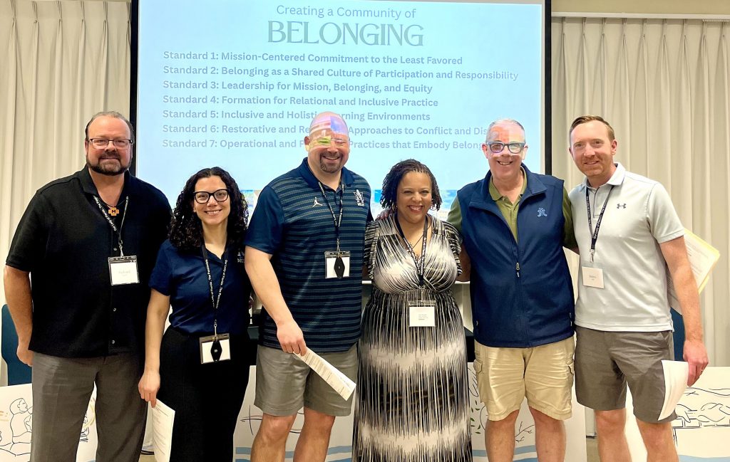 Pictured L-R: President Richard Karsten ’81, Religion Department Chairperson Mrs. Daniela Jelcic, Principal Dr. Darius Penikas, Community & Belonging Coordinator Dr. Alice Prince, Director of Campus Ministry & Marist Mission Mr. Rich Costa, and School Board Member Mr. James Lally ’03.