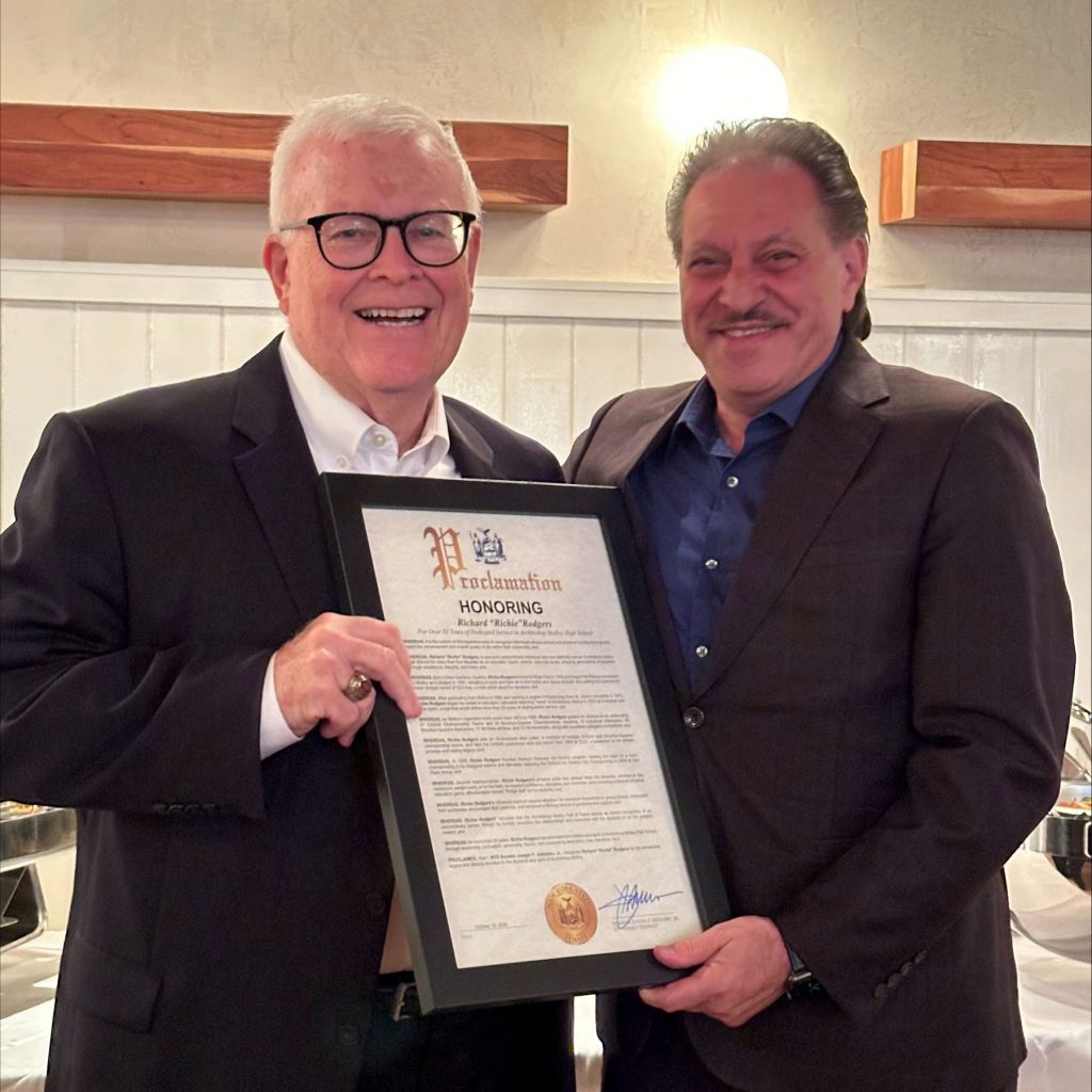 On October 19th, a group of over 70 members of our community gathered at The Harrison Restaurant in Floral Park to celebrate Mr. Richie Rodgers ’65 and his 52 years of service here at Molloy. The group included colleagues past and present, alumni, family, and friends. Members of Mr. Rodgers’s Ice Hockey team and track team were also there in attendance. As a special surprise, Senator Joe Addabbo ’82 presented Mr. Rodgers with a special Proclamation from the New York State Senate! Congratulations, Mr. Rodgers, and thank you for your many years of service to Molloy!