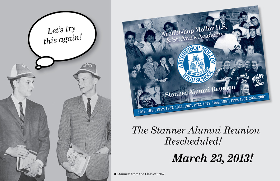 Let’s try this again! Just days after Hurricane Sandy devastated many areas of the east coast last October, Molloy was forced to cancel or postpone many of its events, including the highly anticipated annual alumni reunion. Now we are happy to announce that the Stanner Alumni Reunion has officially been rescheduled for Saturday, March 23rd, 2013. Those reuniting on March 23rd include the Classes of 1942, 1947, 1952, 1957, 1962, 1967, 1972, 1977, 1982, 1987, 1992, 1997, 2002 and 2007. The evening’s schedule is as follows: