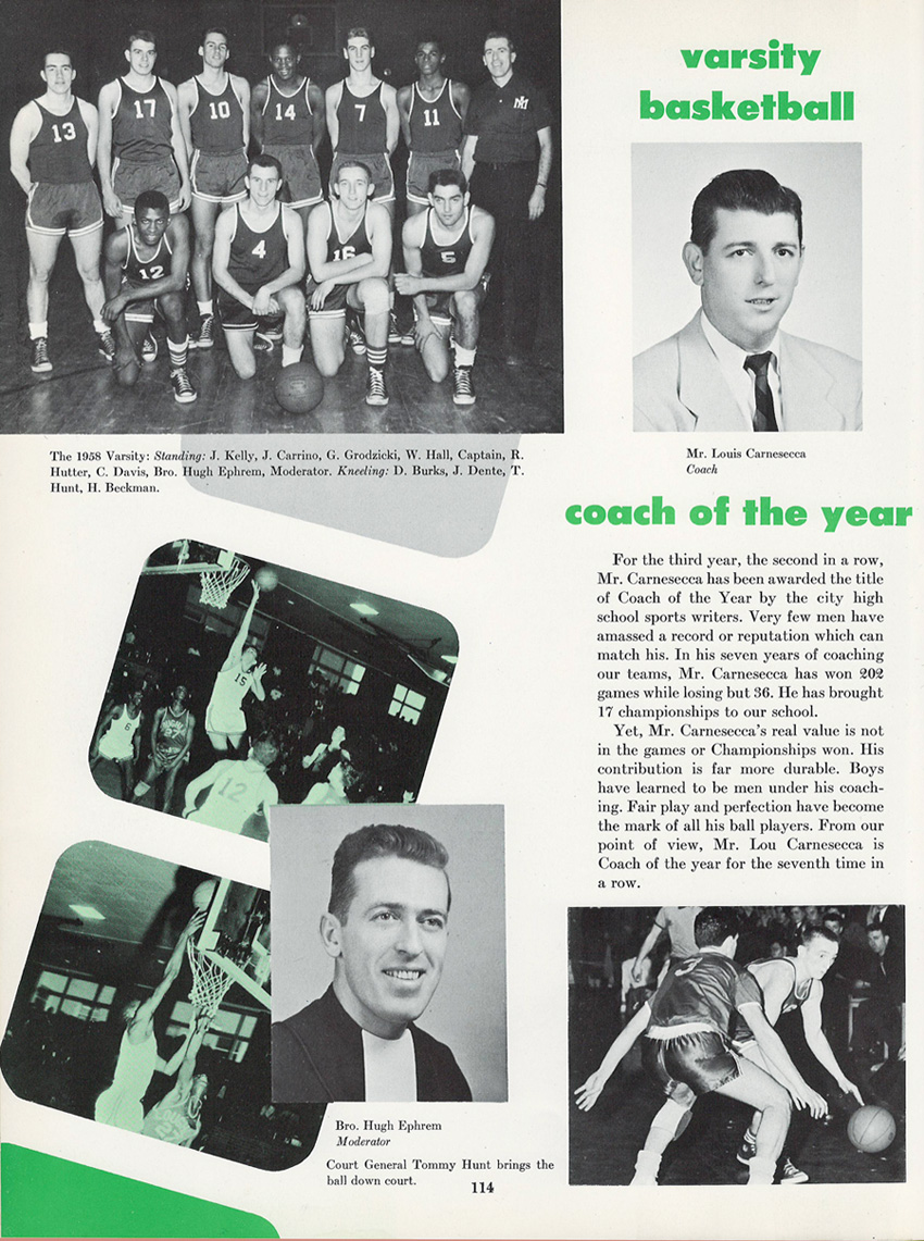 Jim Carrino ’58, currently located in Raleigh, North Carolina, was unable to attend the previously scheduled (now postponed) Curran Gym Rededication. However, Jim sent us warm thoughts about his lasting memories from Molloy (Pictured below: Page 114 from the 1958 Blue & White Yearbook. Jim Carrino is pictured top left with his Varsity teammates.):