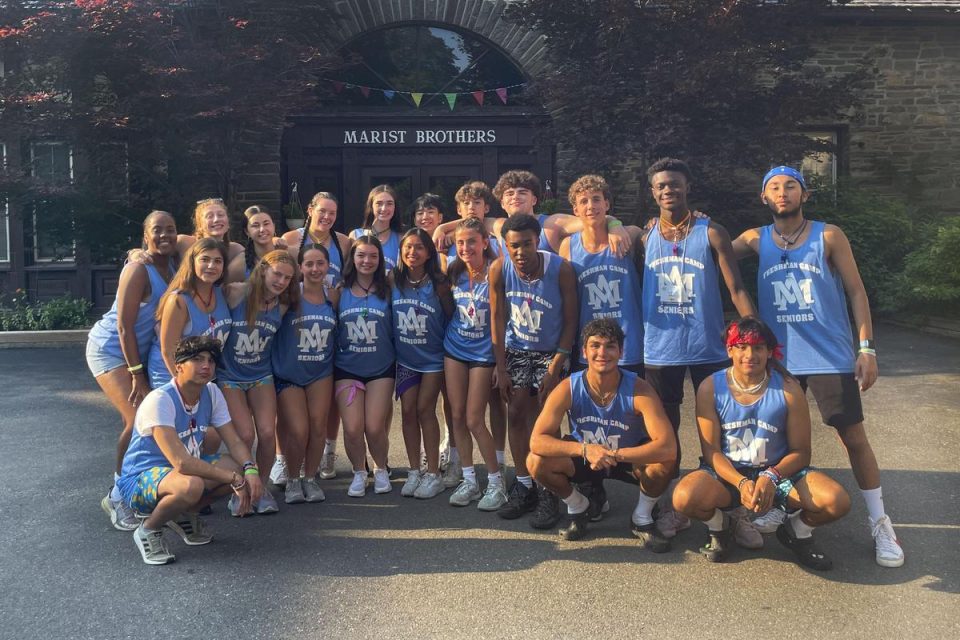 Throughout the day, our newest Stanners heard various presentations about the five Marist Pillars of Presence, Simplicity, Family Spirit, Love of Work, and In The Way of Mary. With this knowledge fresh in their minds, students then broke off into small groups led by upperclassmen to complete various games and activities that represented each pillar. Activities included being led through an obstacle course using only a partner’s voice for direction, figuring out how to get an entire team of people under a jump rope without missing a rotation, and making tote bags full of school supplies that were donated to Queens Borough Hall as part of Project: Back to School, organized by the Coalition for the Homeless. The service project was led by Campus Minister Ms. Rose Haslbauer, who estimated the number of bags donated to be about 80, and that “it was wonderful to watch the freshmen live out the Marist Mission of giving to others.” The day ended with a full-class photo, as the freshmen made the shape of a 27 on Stanner Field.