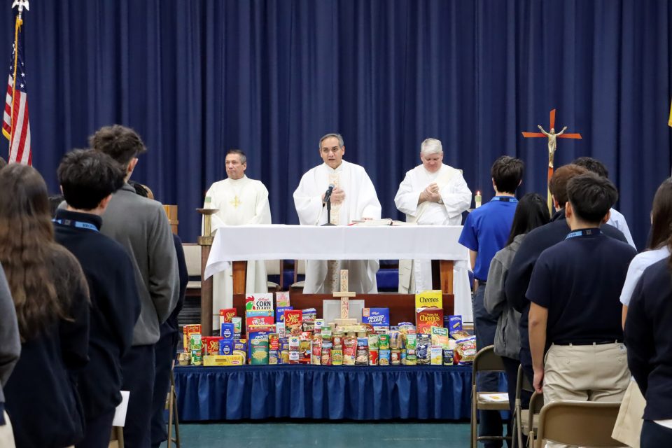 The celebrant of the Freshman/Sophomore Liturgy, Fr. Anthony Rosado, emphasized to the freshmen and sophomores that we can find gratitude in all aspects in our lives, sometimes in the most unexpected places. Fr. Joseph Franco ’93, celebrant of our second Liturgy of the day, emphasized to the juniors, seniors, and alumni the importance of giving thanks, and that God desires more than a relationship with us, but true presence with him. Seniors Amelia Volker ‘25 and Tiffany Esquen ’25 then closed the Liturgy by speaking to their classmates about the impact of Molloy’s recent food drive, and how the drive was a modern reflection of Jesus’s miracle of the loaves and fishes. With every student bringing in one food item each, a huge number of lives were positively affected this season!